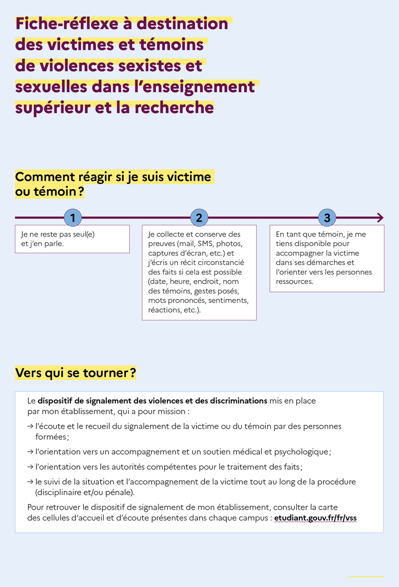 ? Télécharger la fiche réflexe à destination des victimes et témoins de VSS dans l'ESR